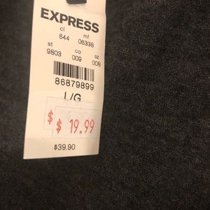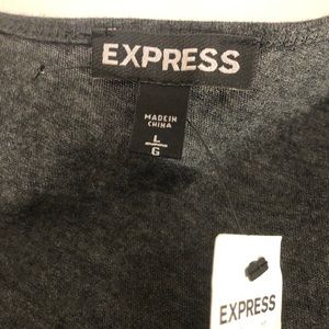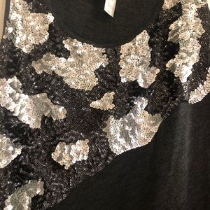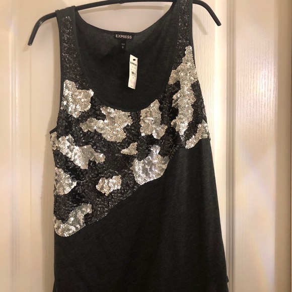 Charcoal gray sequined shell by ‘Express’ in a size large. Tank has scoop neckline with diagonal pattern in silver and black sequins. Full back coverage. Original retail value of $$39.90.