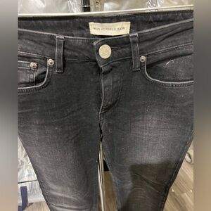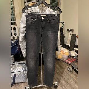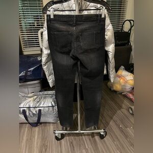 These charcoal skinny jeans offer a sleek and modern silhouette with their tapered leg design. Crafted from stretchy denim, they provide a comfortable fit while the subtle distressed detailing adds a touch of character. Inseam 29