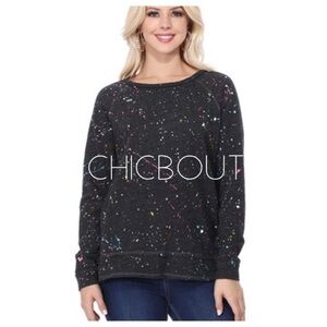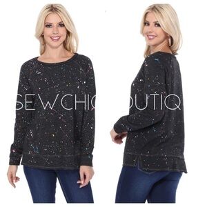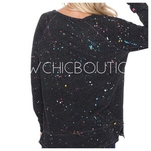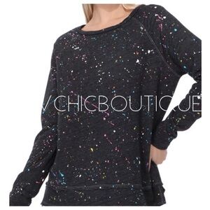 Charcoal Long Sleeve Soft Sweatshirt with paint splattered all over. The will be your new favorite sweatshirt. So soft inside, not heavy, good for layering. Featuring drop shoulders, side slits, contrast seams in white thread, and raw edges. Love 💕 this!! Wear with jeans or joggers. Not a lot of stretch to this.