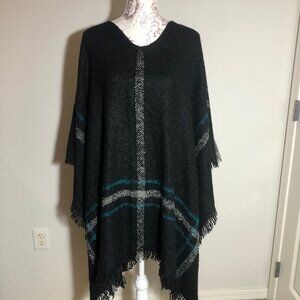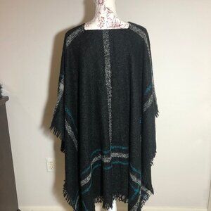 Charcoal & Teal Stripe Poncho Wrap with Fringe Hem