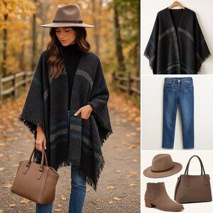 Effortlessly cozy meets timeless sophistication in this beautiful charcoal poncho wrap, designed with subtle teal & gray stripe accents and soft fringe trim. Perfect for layering across seasons, this piece brings that quiet luxury touch to your fall & winter wardrobe — whether you’re headed to a city café or a weekend cabin retreat.