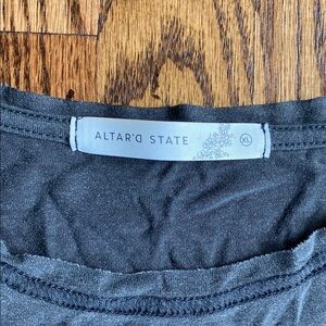 Charcoal gray, cropped Altar’d State t-shirt, size XL. Very soft, raw hem on the bottom. Tiny hole on left collar, see pictures. Ships quickly from smoke free/pet friendly home.