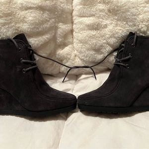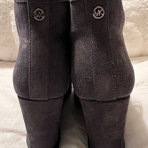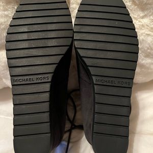 Charcoal grey lace up wedge boot. In Excellent like new condition. The eyelets for the laces, the lace end caps, and the MK symbols are all in a gunmetal grey color. From smoke free home.