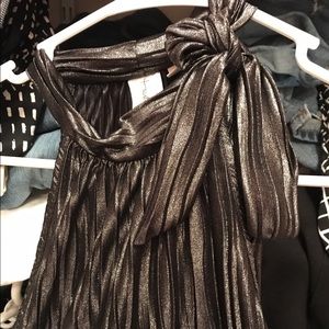 Charcoal, high cut top. Shirt has a shimmer to do and looks great for a night out on the town! NecklIne can be tied into a bow or a knot.