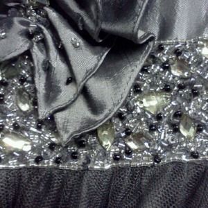 UPPER: strapless, striped silver/charcoal with ruffles ,sequins. TORSO BELT: jeweled with a light green diamond jewel LOWWER: flowy ball gown charcoal grey net type and silk under 5 layered bottom