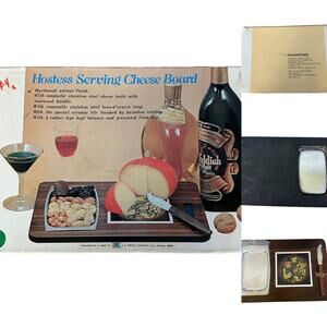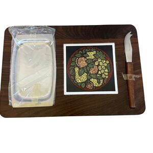 Includes board, cheese knife, silver nut tray, in original packaging and coverage appears to never have been used. Great Mid Century Modern find