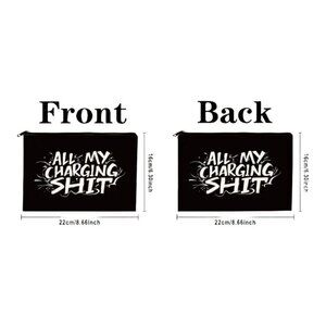 This little black pouch is made of canvas, so it feels pretty sturdy. It's got a zipper to keep everything inside, and the white writing on it is pretty bold and to the point. It's meant for keeping your charging cables and plugs together, but you could use it for other small stuff too. It's a good size for throwing in your bag or suitcase, and it's a handy way to keep things from getting tangled up.