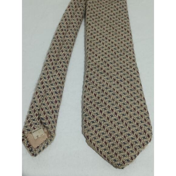 Classic tie from Charing Cross. This tie is made in Italy from 100% wool. It features a pattern of woven red and dark blue stitches on a tan background. It measures about 52 in long and is 3 in wide.