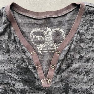 This is a Charles & 1/2 henley with horizontal stripes and pain splatter effect.