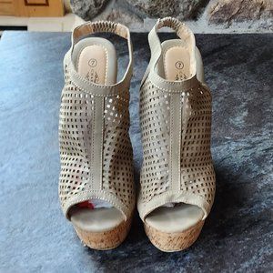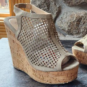 Charles Albert Beige Perforated Cork Open Toe Wedge Slingbacks Size 7. Perfect for spring and summer outings. Excellent condition.