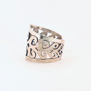 This intricately designed cuff bracelet in sterling silver offers a timeless elegance, featuring an openwork pattern that showcases expert craftsmanship.
