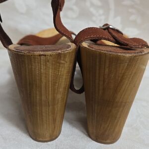 Wooden platform sandals with brown suede. These are great except for the inner soles..the inner sole has dark marks and some glue residue. Other than that ready to wear.