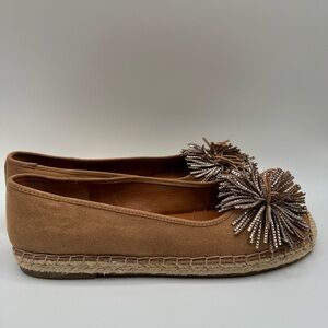 Stylish tan espadrilles with unique embellishments. Perfect for casual elegance.