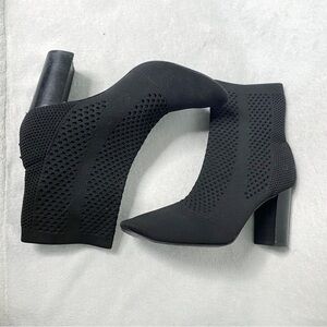 In excellent preowned condition, Charles By Charles David black mesh banker bootie heels. Fits a size 8. Has a stretchy black mesh exterior, with solid block short heel, and pointed toe look. Comfy and classy, perfect for dressing up, work, or casual wear.