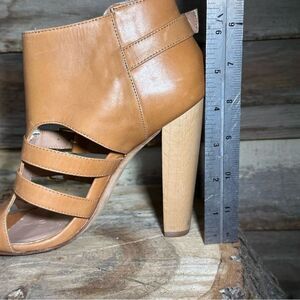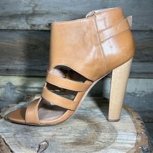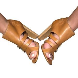 Tan leather open-toe sandals by Charles David. The sandals feature a high ankle design with two gold buckles on each shoe for fastening. The shoes have a cutout design on the sides and a strap across the toes. The shoes are stylish and modern, suitable for casual or semi-formal occasions.