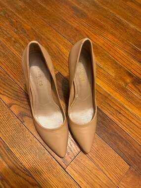 Charles by Charles David Pointed Toe Pumps in a versatile nude/tan leather. These classic stilettos feature a sleek silhouette and a high heel, making them perfect for professional wear, weddings, or formal events.