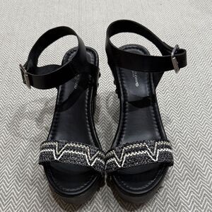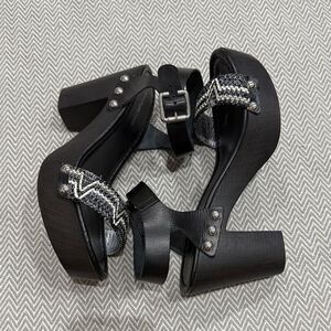 Stylish platform sandals with black and silver accents. Features adjustable ankle strap. Perfect for elevating any outfit.