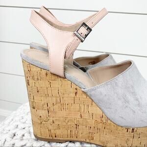 Design: Faux suede wedge sandals, open toe, ankle strap, buckle closure, cushioned footbed, 5 inch towering cork wedge heel