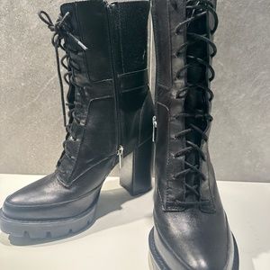 Towering heel and aggressive lugged sole add take-charge style to the Gimmick lace-up boot from Charles David. Buckle hardware is fitted at the ankle and a stretchy, ribbed shaft creates a soft fabric fit. Color is black, Size 7.5 Features: leather & fabric upper, Inside zipper closure, Optional lace-up closure, Almond toe, Synthetic lining, Rubber lug sole. Approx. 7" shaft height Approx. 9" leg opening, 1" platform, 4.25" block heel. Only worn a few times indoors. Never noticed this until preparing to list, but the left boot is marked as 7.5M and the right boot is marked as 8M. Never noticed when wearing. Also, if you put the shoe bottom together they are identical in length. I think the right one is just mislabeled.
