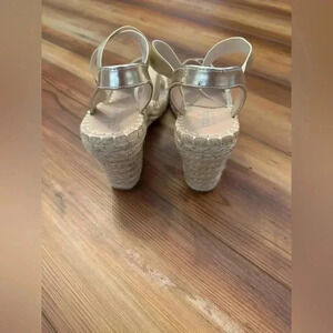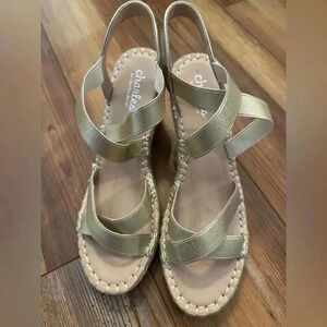 These Charles David sandals feature a chic crisscross strap design in gold and cream, complemented by a woven espadrille-style wedge heel. The adjustable ankle strap ensures a secure fit, making them perfect for summer outings or resort wear.