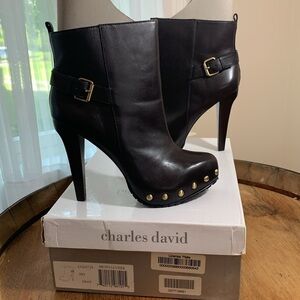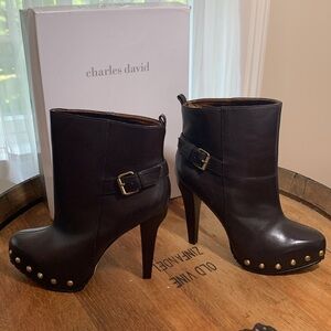 Charles David brown leather booties. The studded accents and buckle detailing add a touch of edge to the classic round toe and pull-on closure. The high heel platform design provides a comfortable fit with a cone-shaped heel style. These boots are a must-have addition to any shoe collection, suitable for all seasons.