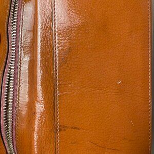 Orange Brown leather with metal monogram pocket clasp and chain design made into the strap. Exterior: Fair Condition. Interior: Excellent Condition. Markings shown in photos. Previously owned.