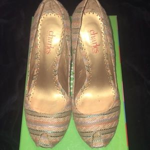 Size 6 tan with colored woven stripes peep toe heels. Good condition with original box.
