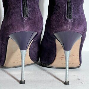 Pointed toe western cowboy boot in eggplant purple suede. Western stitch details on toe, with pink Swarovski patterned crystals on shaft, both sides of each boot. Heel is metal, with purple lacquer top. Back zip. In really good condition. Leather sole has been modified with rubber for better traction. Moderate scuffing on suede from storage. Heel is 4 inches. Super pointed toe.