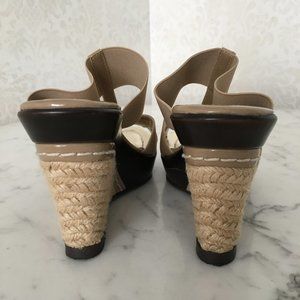 Stylish wedges for summer! Neutral camel with dark brown accents. Elasticized straps, woven straw heel. Worn only once or twice, like-new condition, original box. IMPORTANT: These run a full size small and are NOT a 7.5! I am a true 6.5 and they fit perfectly. If your foot is larger than a 6.5, they will be too small!