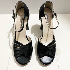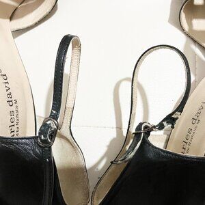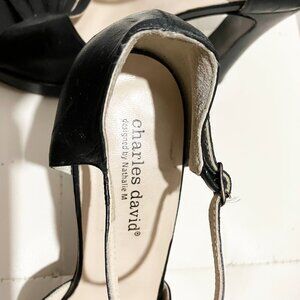 Own these sexy vintage Charles David open toe high heels designed by Nathalie M. These beautiful shoes feature black leather, a 4 1/2 inch block style heel with a platform accent, a chic open-toe design, and adjustable strap. In good pre-owned condition. There is normal wear on the heels and foot bed, with some damage to the straps. See images. These are perfect to add a vintage flair to your wardrobe.