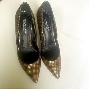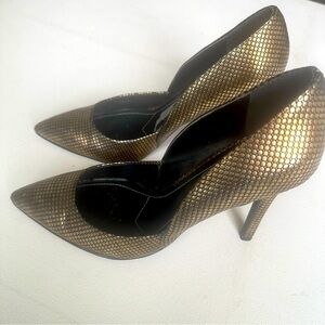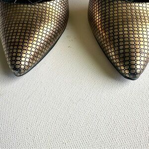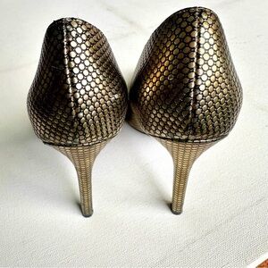 Preowned metallic gold pumps in good condition. See photos for slight wear to the inner lining, not noticeable when worn. Heels intact. Very flattering pump with great toe cleavage. Neutral color goes with everything.