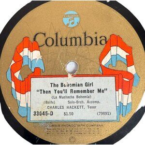Step into the enchanting melodies of Charles Hackett, one of the iconic tenors of his time. This Columbia shellac record, catalog number 33045-D, includes the timeless classic "Drink To Me Only With Thine Eyes," based on Ben Jonson's poetry, and "Then You'll Remember Me" from Balfe’s "The Bohemian Girl."