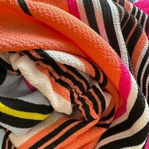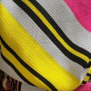 Style tags: Charles Henry dress hi low hem shorter front longer back pink orange black yellow stripe ruffle top off shoulder