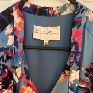 Beautiful and cheerful floral print, with flutter sleeves and tie/scarf accent at neckline. Simple sheath cut, hits above knee. Easy to wear, very comfortable. Worn one time for wedding. In great shape.