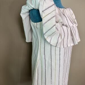 Charles Henry off shoulder ruffle top mini dress in women’s size S - lined with very lightweight material creating a cool and breezy look and feel. Metallic pin striping in pastels adds subtle color and style. Pop over design. So soft ! Should fall about mid thigh on most. Nice thick comfortable band of elastic around the top (no scratchies ) My FLAT measurements are length (neckline elastic to hem is 29”, smallest waist is 17”. Excellent condition as it has never been worn. Thank you so much for your consideration of this off shoulder ruffle mini dress by Charles Henry for Nordstroms !