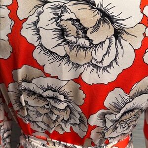 Elegant long sleeve dress with bold floral pattern. Features a wrap design and tie waist. Perfect for any occasion.