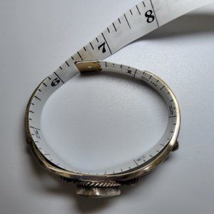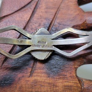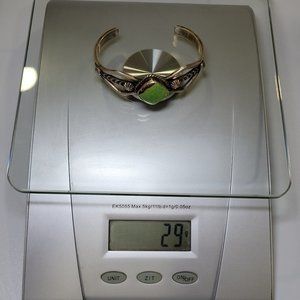 Vintage piece by Smithsonian Navajo artist Charles Johnson. Stone is believed to be Gaspeite. Stamped with his maker's mark and "Sterling". It weighs approximately 29 grams.
