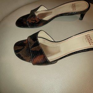 Charles Jordan Black/Brown Snakeskin Cross Bridge Sandals Size 7