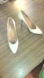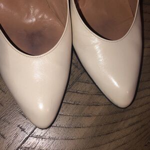 Size 8. Narrow. 4” heel. 3” widest part of footbed. 10” footbed. Leather upper, insole and sole sanitized, cleaned and stored properly. Please see the Measurements and pictures. Insoles and logo intact. Minor scuff inside shoe. Some scuffing on soles. Really classic neutral. Comes in a Real Real duster that is in used condition and for storage shipping only.
