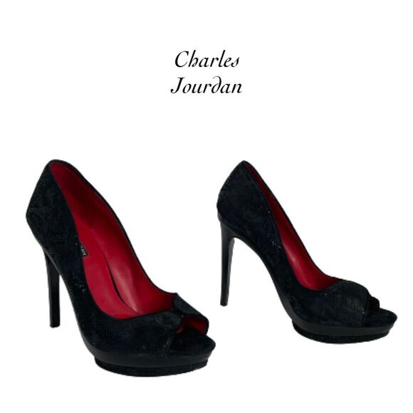 Charles Jourdan Black Snake Print Peep Toe Platform Stiletto Heels Size 11