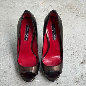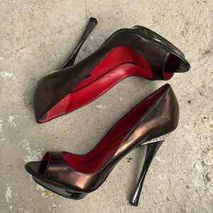 Super nice and in great condition check out the pictures. Color is like a shiny metallic bronze with a metal style heel. He’ll height is 5.25 platform height is .5.