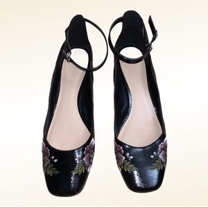 Charles & Keith Black Patent Leather Ankle Strap Low Heeled Pump with Embroidered Flowers