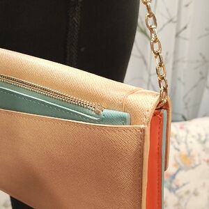 Stylish clutch with a tan top and green base. Features a sleek chain strap. Perfect for versatile wear. (stain on the inside)