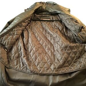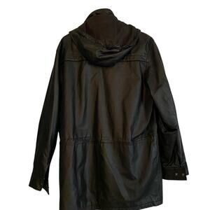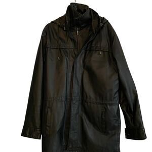 This sleek black leather stadium jacket combines the classic varsity style with a modern twist. Crafted for both comfort and style. Ideal for casual outings or a night out, this jacket is a versatile addition to your wardrobe. Removable lining and hood. Zips up and snaps closed. Size M. 33 inches length. 48 inches chest.