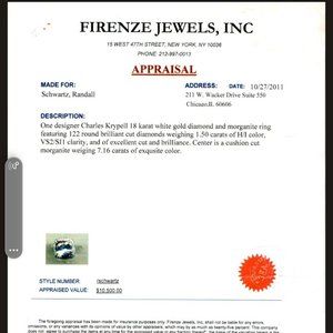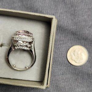 Charles Krypell 18 karat white gold and morganite/diamond ring. 7.16 carat cushion cut morganite and 122 round brilliant cut diamonds weighing 1.5 carats see appraisal attached size 7 but has inserts to make it smaller that can be removed. (knobs)