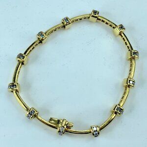 It featuring long curved bar links with a small wheel shape links set between each long bar link, each wheel has round cut diamonds, all totaling 3 carats. The bracelet secure with a push clasp and has a hidden latch for added security. The clasp has the designer hallmark with the gold content.