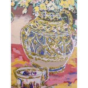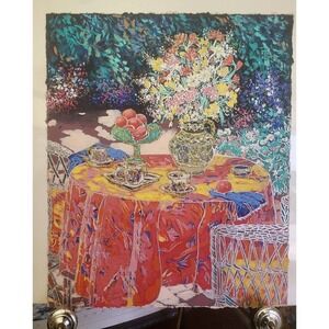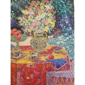 This stunning painting by Charles Lee features an elegant tea party setting with beautiful floral arrangements. The piece is signed by the artist and measures 24.5 inches in height and 20 inches in length, making it a perfect addition to any art collection.