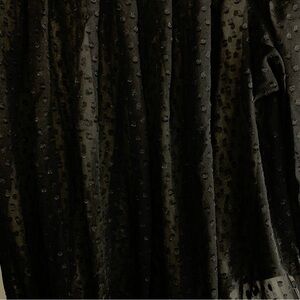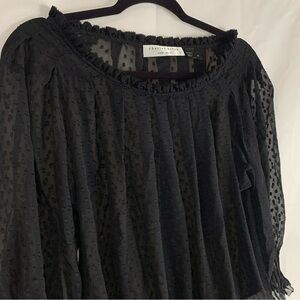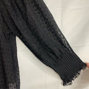 Elevate your wardrobe with this elegant Charles Nolan black silk blouse, featuring a sheer textured dot fabric and a flowy silhouette. Designed with a smocked hem and cuffs for added shape and feminine flair, this top is perfect for both day and night. The lightweight material and soft ruffle trim at the neckline give it a romantic touch. Pair it with denim or tailored trousers for a polished look.