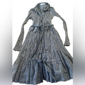 Charles Nolan black and gray striped button front long sleeve maxi dress,size 10.  This is a fully lined, long sleeve, collared dress with pleats.  It is full hidden button front with a waist tie. The button at the waist is missing and the first button below the waist may be a replacement. There are no holes, rips, tears or stains. It flat lay measures 16” pit to pit and 39” shoulder to hem. (All measurements are approximate).