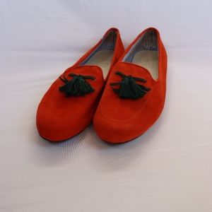 Charles Philip Moccasins (Shanghai) in orange suede leather, with green suede tassel. Moccasin effect stitching on the toe. Hand-sewn tassel. Rubber sole. Leather Lining and Insole. Cotton hemming. Internal heel cushion for maximum comfort. Excellent condition. Size 12.